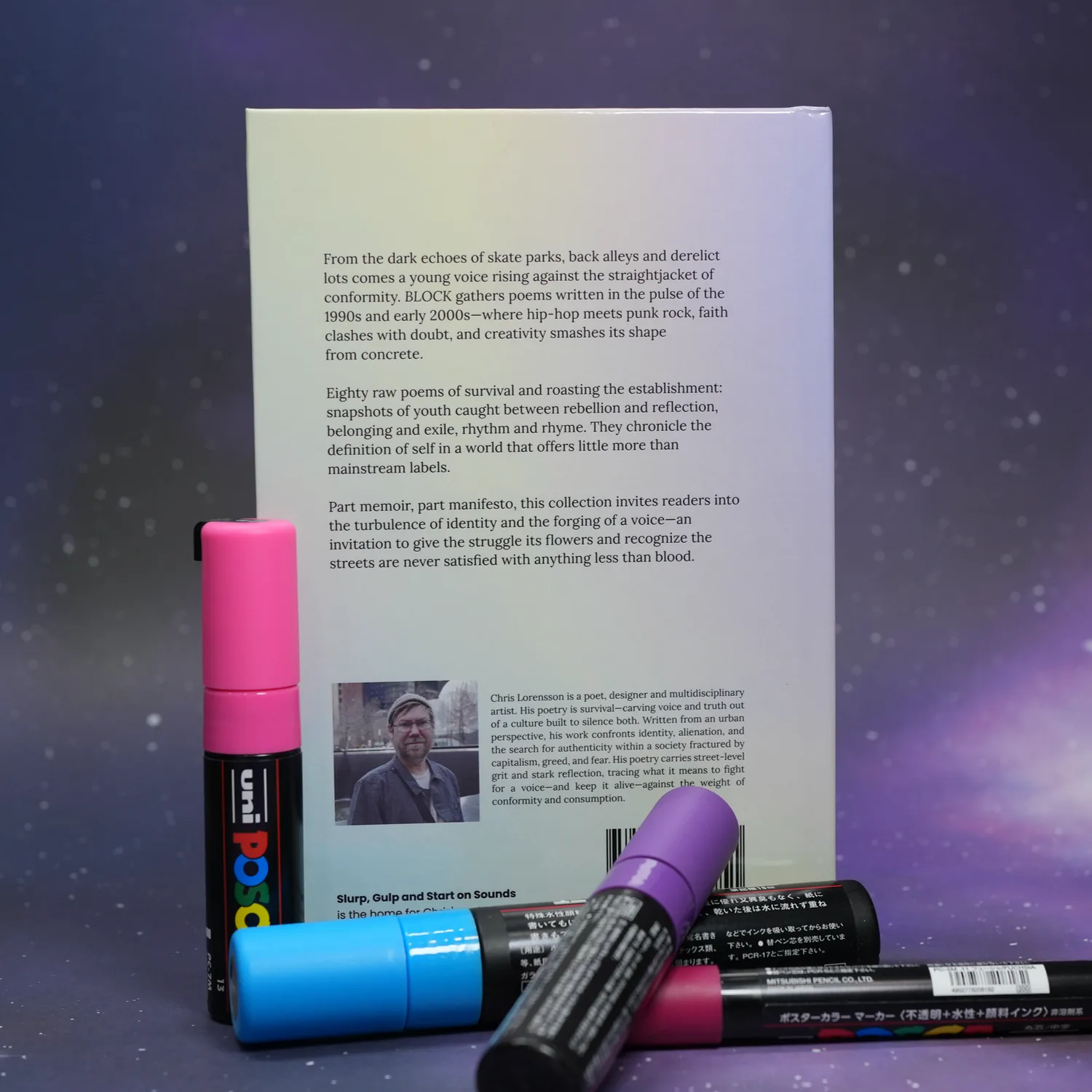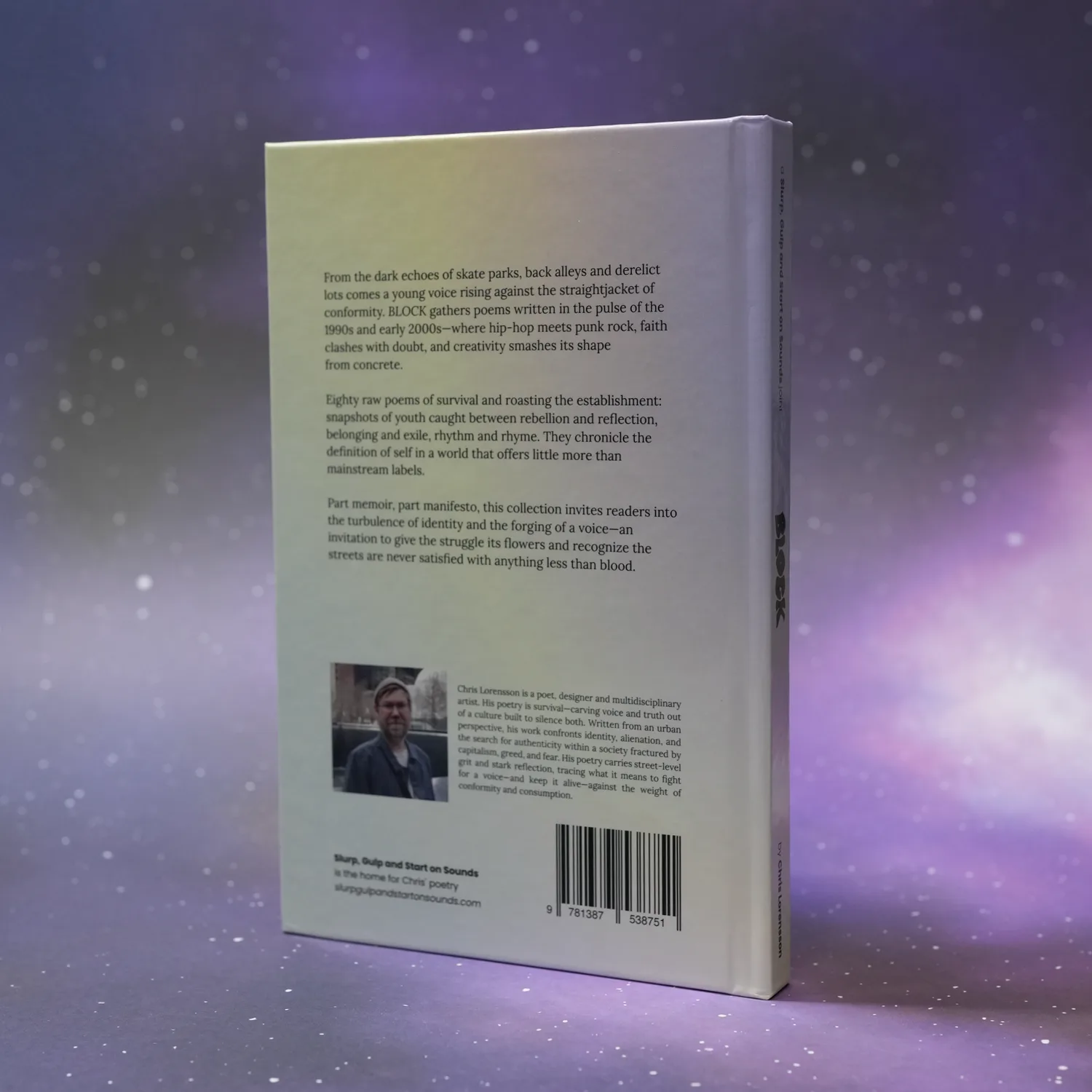 From the dark echoes of skate parks, back alleys and derelict lots comes a young voice rising against the straightjacket of conformity. BLOCK gathers poems written in the pulse of the 1990s and early 2000s—where hip-hop meets punk rock, faith clashes with doubt, and creativity smashes its shape from concrete.